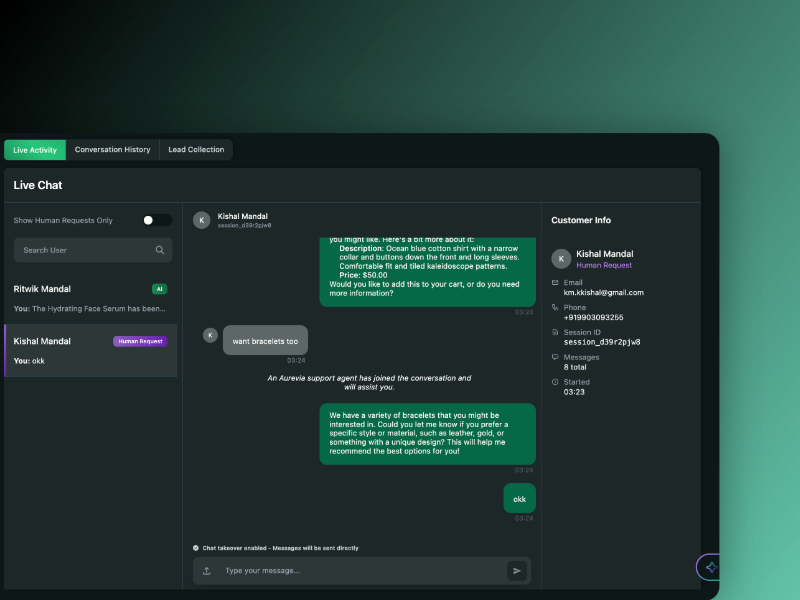 Visual dashboards reveal conversation sentiment, drop-offs, and top-selling SKUs. Export collected leads or correct past mistakes in seconds to keep conversions climbing.