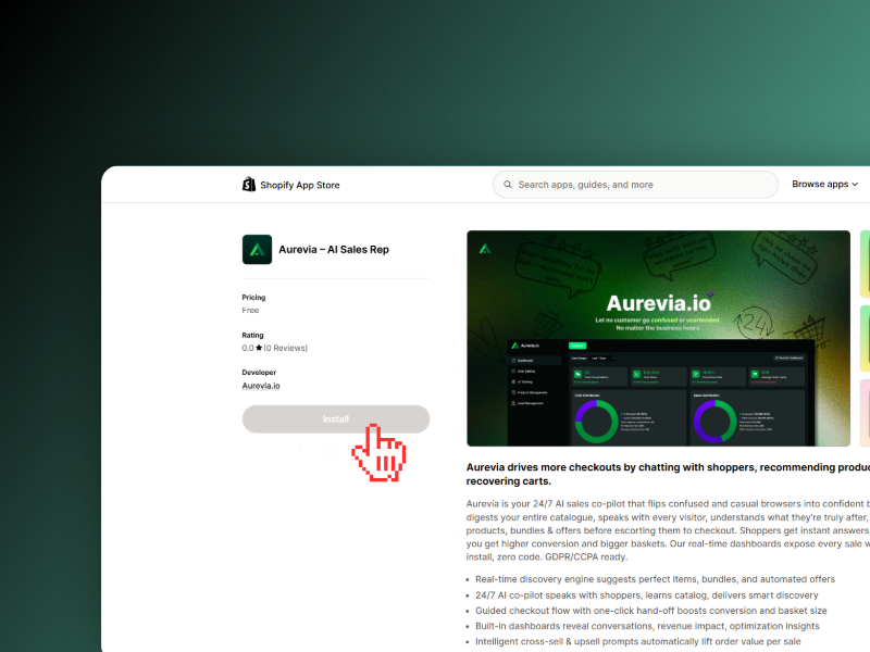 Aurevia's Shopify-native AI spots exit intent, answers last-minute questions, and drops a one-click checkout link — rescuing lost revenue.